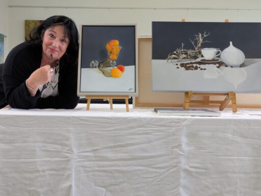 Angelika Bohnen präsentiert neben fotorealistischen Stillleben auch farbkräftige Acrylbilder mit abstrakten Motiven und Collage-Elementen.