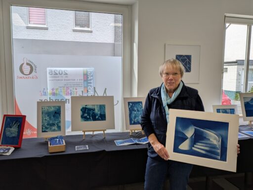 In der Freiwilligenbörse gibt es ebenfalls viel Raum für Experimente. Christine Hein zeigt neue Möglichkeiten der Cyanotypie. Wasser und Wellen formen organische Strukturen, wenn das Material am Strand ins Meer gelegt wird. Mit Negativen von Fotos entstehen weitere spannende Effekte.