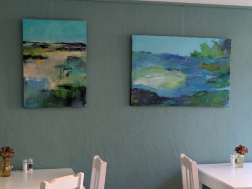 Auch die Bilder von Gaby Hermann im Sannie Bistro & Catering scheinen eigens für den Raum geschaffen, so exakt passen sie sich der Farbgestaltung an. Landschaften, die Ruhe ausstrahlen, stehen neben Arbeiten in blumiger Farbigkeit.