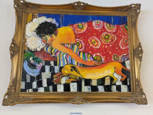 In der Stadtteilbücherei Hösel zeigt Tamuna Meburishvili verspielte Traumgeschichten, die an Chagall erinnern. Ihre Motive entstammen oft der Familie – die „Schlafende“ ist ein Selbstbildnis.