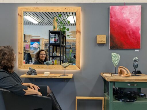 Bilder und Skulpturen in einem Verkaufsraum wirkungsvoll zu platzieren, ist ebenfalls keine leichte Aufgabe. Nicole Malcherowitz, eine besonders vielseitige Künstlerin, zeigt ihre Werke in der entspannten Atmosphäre des Friseursalons und Second-Hand-Geschäfts Flotte Friese.