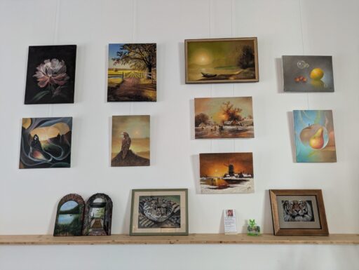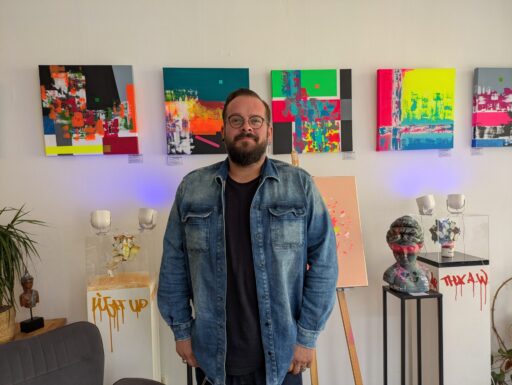 Patrick wiederum hat erst vor wenigen Wochen den Dremel gegen den Pinsel getauscht – und eine beeindruckende Vielzahl an Bildern geschaffen. In seinen leuchtenden Lieblingsfarben, teils fluoreszierend, strahlen sie sogar im Dunkeln. Auf geometrischen Hintergründen entfalten sich bunte Elemente, die für ihn das Leben in all seinen Facetten symbolisieren.