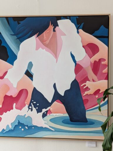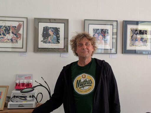 Auch Svend Dunkhorst und Patrick Hoffmann zeigen bei Hörakustik Plaßmann ein neues Spektrum. Svend hat zum Zeichnen zurückgefunden. Auf dem iPad entwirft er Fantasiewelten mit Figuren aus dem Science-Fiction-Genre – ohne KI, ohne Vorlagen, wie man vielleicht vermuten würde. Feingeschnittene Papierelemente und Blattgold vollenden seine Bilder. Er plant sogar, ein Buch zu seinen Bildwelten zu veröffentlichen.