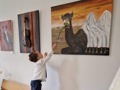 Michael Troesser malt häufig Tiere, oft mit surrealen Brechungen. Zentral ist seine Leuchtgiraffe, die Bürgermeister Pesch einst seinem Kollegen in Maubeuge als Symbol der Städtepartnerschaft schenkte.