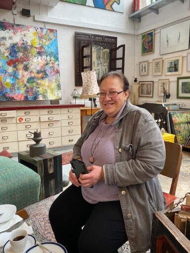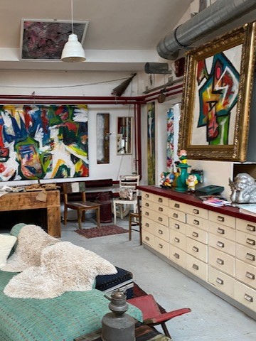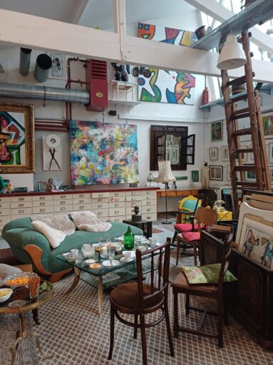 Was von außen wie ein herkömmliches Wohnhaus aussieht, tut sich, wenn man das Atelier betritt, als eine andere Welt auf: eine 400 m² große, in mehrere Räume unterteilte, lichtdurchflutete Halle mit hohen Glasdächern. Wo sich heute ein Atelier, ein Showroom und ein großer Ausstellungsraum mit Café-Ambiente befinden, war früher eine Seidenweberei untergebracht. Neben einer Fülle unterschiedlichster Kunstobjekte entdeckt man auch ausgefallenen Trödel. Man weiß gar nicht, wo man zuerst hinschauen soll. Immer wieder tun sich neue Facetten auf. „Ach, guck mal!“ – mein meistgesagter Satz an diesem Nachmittag.