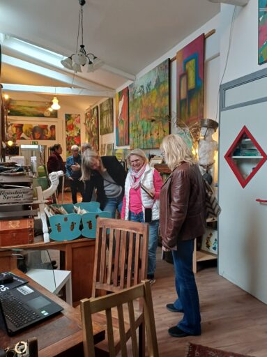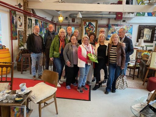 „Wir machen einen Ausflug!“ Nach vielen Ausstellungen eine gute Idee von Pauline Kugler, die Kunstgenuss und darüber hinaus die Möglichkeit zu einem kurzweiligen Gruppenerlebnis bietet. So machten sich 15 Teilnehmer am 3. Oktober auf nach Krefeld-Hüls in das Atelier Galerie Sof. Am Ende war man sich einig: Ein tolles Kunstevent – der Weg hat sich gelohnt. Im Atelier erlebt man nicht nur einen anregenden Kunstraum, man wird auch auf das Herzlichste empfangen und bewirtet und verbringt eine schöne Zeit in Gemeinschaft mit Gleichgesinnten.