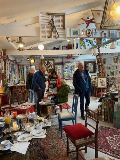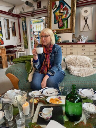 Vor dem Kunstgenuss steht das leibliche Wohl. Die Künstlerin Sophie Voigt-Chadeyron und ihre Freundin und Managerin Christa Meier begrüßen ihre Gäste mit einem Glas Sekt. Die Tische sind liebevoll gedeckt und herbstlich dekoriert, der selbst gebackene Pflaumenkuchen noch warm. Man sitzt gemütlich auf alten Sofas und Stühlen, redet und schaut. „Ach, guck mal!“