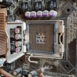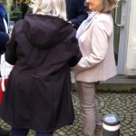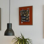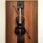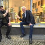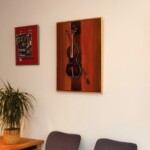Auf dieser Wand hinter der Theke des Ladens zeigen zwei weitere Künstler ihre kreativen Ideen in Assemblagen. So will Michael Troesser durch eine reale, mit Bronze verfremdeten alten Geige als „Klang-Körper“ auf die Wichtigkeit des Hörens grade in einem Hörakustikgeschäft hinweisen. Mit seinem Werk „KI“ zeigt er Arbeiter, die einen Computer geschaffen haben, durch dessen Verselbständigung ihre eigene Arbeit eines Tages überflüssig werden wird.