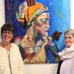 Betritt man den Raum, erwartet einen eine große, quadratische Assemblage der Ratinger Künstlerin Sarah Rose. Vor einem blauen Farbverlauf sieht man das Portrait einer stolzen Frau von der Seite, die mit geschlossenen Augen von der opulenten Farbenvielfalt zu träumen scheint, deren große Strahlkraft ein wenig an Frida Kahlos Farbenrausch erinnert.