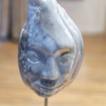 So präsentiert Pauline Kugler ihren Frauenkopf aus Gala (ein besonders harter Speckstein) , der vor allem durch den Kontrast von glatt gearbeitetem Gesicht und kunstvoll geformten, raueren Haaren besticht.
