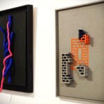 Hier zwei farbige, ineinander verwobene, länglich gebogene Stilelemente auf dunklem Grund, daneben an Ziegelsteine erinnernde, ebenfalls zweifarbige hartkantige Elemente auf hellem Grund, Werke in diesem Arrangement von enormer Spannungskraft.