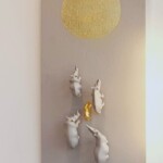 Von Norbert Bongardt sehen wir eine aus silbernen großen Nägeln geformte, halbrunde Skulptur, die an Uecker erinnert, vor allem aber eine sehr kreative und sinnträchtige, hochformatige Assemblage, in der graue, dreidimensionale Nashörner einer goldenen Sonne entgegengehen. Zwischen den Nashörnern steht ein kleineres, junges, golden strahlendes Tier als Symbol dafür, wie wichtig und wertvoll die Natur vor allem für die Zukunft unserer Kinder ist, die es zu schützen gilt.