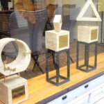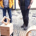 Patrick Hoffmann, auch erst seit kurzer Zeit Mitglied im Verein, braucht für seine mittelgroßen, oft geometrisch gestalteten Natursteinarbeiten fast ein gesamtes Schaufenster, in dem er seine Arbeiten zeigt. Die kunstvoll ineinandergefügten Steine bekommen ihre besonderen Reiz durch sehr filigran geformte Insekten, die er mit 24-karätigem Hartgold verzieren ließ. Sie scheinen magisch von den beigefarbenen Steinskulpturen angezogen zu werden.