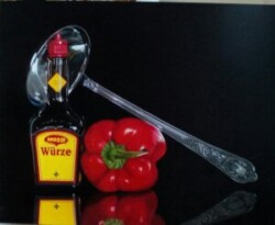 So wurde die Leidenschaft für die photorealistische Darstellung von alltäglichen Gegenstände geboren, die sich inzwischen Richtung Hyperrealismus entwickelt hat. Mein einziges Ziel ist die Faszination und Freude der Betrachtenden , die plötzlich merken, dass sie vor einem gemalten Bild und nicht vor einem Foto stehen wie bei einer einer optische Täuschung . So sehen sie Details von Alltagsgegenständen, die sie zuvor niemals wahrgenommen haben. Inzwischen ist die Pastellkreide durch Ölfarben ersetzt worden, und ich habe von diversen Malern in Europa und Nordamerika lernen können, aber die Prinzipien des Malers Jesus bilden immer noch das Fundament meiner Arbeiten.